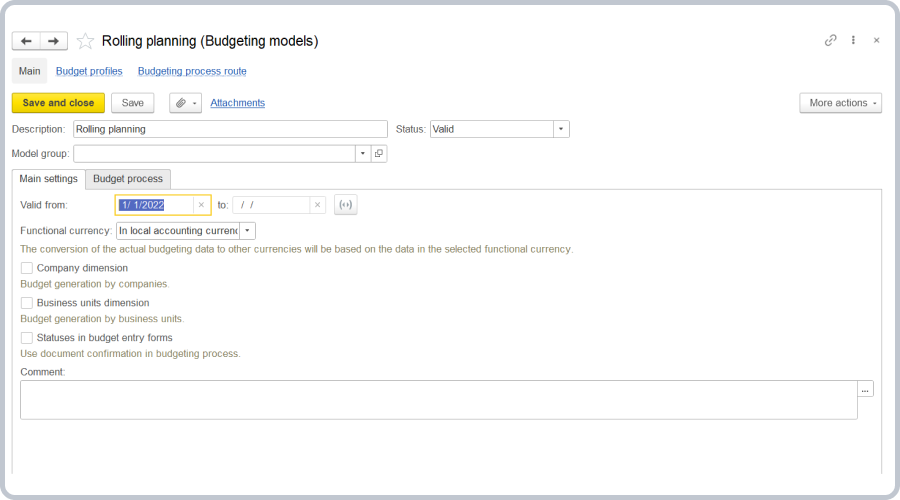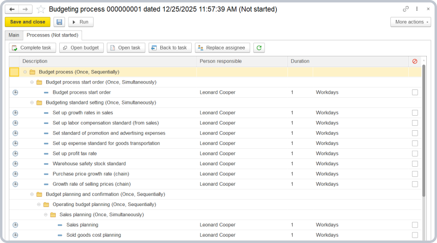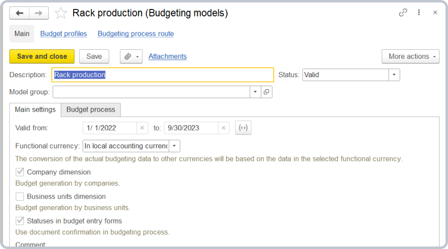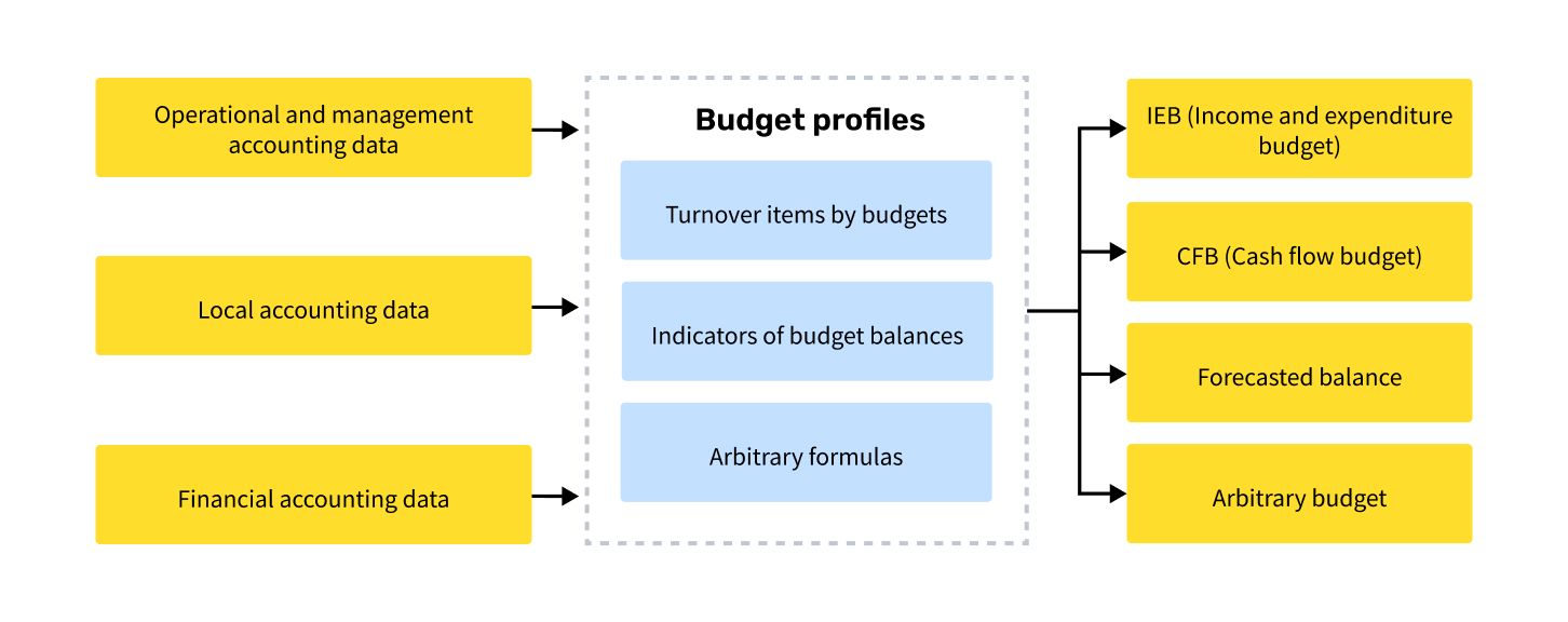 The budgeting process in the system involves presenting budgeting regulations as budget process steps: entering planned data, calculating plans, monitoring plan execution, and conducting variance analysis.