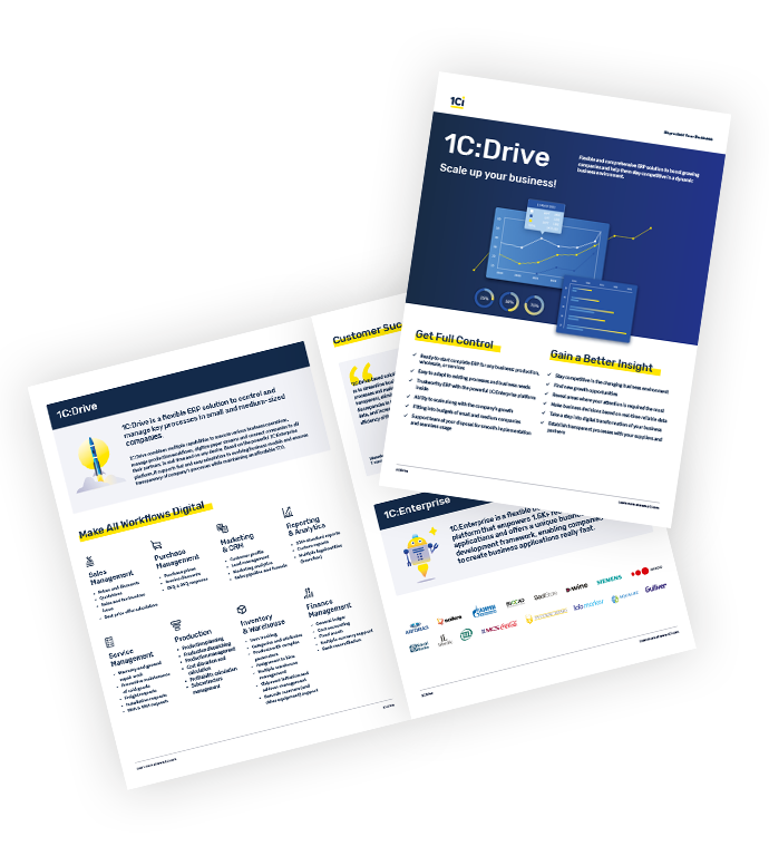 Inaugura anche tu la trasformazione digitale della tua azienda! Scarica il volantino per scoprire di più sull'ERP di 1C:Drive: caratteristiche, tecnologie, processi coinvolti, benefici per le industrie di Produzione, Servizi, Vendita all'Ingrosso e Distribuzione.