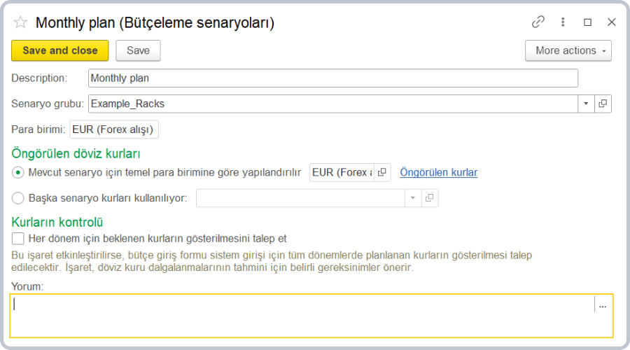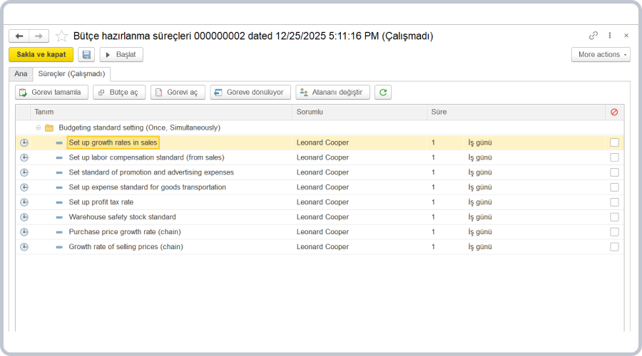 Satış tahminlerine ve satın alma planlarına göre ödemelerin planlanması. Bütçeleme'nin entegrasyon yetenekleri, bir iş modeli oluştururken diğer kaynaklardan (örneğin satış tahminleri, satın alma ve üretim planları) gelen verileri dikkate almayı mümkün kılar. Sistem, işletmenin ticaret ve satın alma faaliyetleriyle ilgili planlama belgelerinden ortaklar, cari hesaplar, sözleşmeler, nakit akışı öğeleri gibi boyutların otomatik olarak doldurulması destekler. Ayrıca, hem seçilen bütçe kalemi için ödemelerin planlanması hem de avans ve sevkiyat sonrası ödemeler için ayrı ayrı planlama mümkündür.